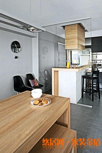 對(duì)小戶型來說最適宜的廚房設(shè)計(jì)選擇,用玻璃墻的方式圈出了廚房的區(qū)域,又不破壞整個(gè)客廳空間的完整、方正和一體。