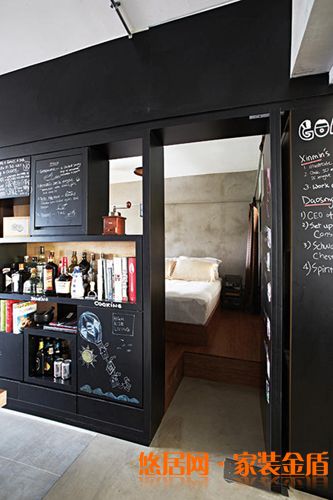 對(duì)一個(gè)小戶型來說,空間的即開即合性能越強(qiáng),使用的舒適度就越高,因此在設(shè)計(jì)時(shí),設(shè)計(jì)師一般都非常注意隔斷的靈活性,這個(gè)臥室隔斷墻體就采用了抽屜+擱架一體的設(shè)計(jì),為的是不將隔斷做實(shí),也能為臥室提供私密性,當(dāng)然,如果你愿意折騰的話,這個(gè)隔斷墻體上的所有柜子都是能夠搬下來重新排列的,這就是妙處。