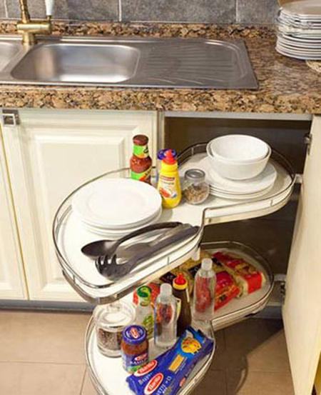 CASE4:轉(zhuǎn)角空間利用,櫥柜中的多層設(shè)計可以方便常用物品的收納,這樣的轉(zhuǎn)角層架,能很好地利用轉(zhuǎn)角空間,轉(zhuǎn)盤式設(shè)計也方便使用,L型、U型櫥柜都可以考慮有這樣的一個層架哦。