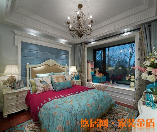 淡藍(lán)色的墻面讓本來憂郁的藍(lán)色更加富有生機(jī)和活力,這種浪漫一直延伸到整個(gè)主臥的空間。高貴的紅色、圣潔的白色,法蘭西宮庭花紋遙相呼應(yīng)。