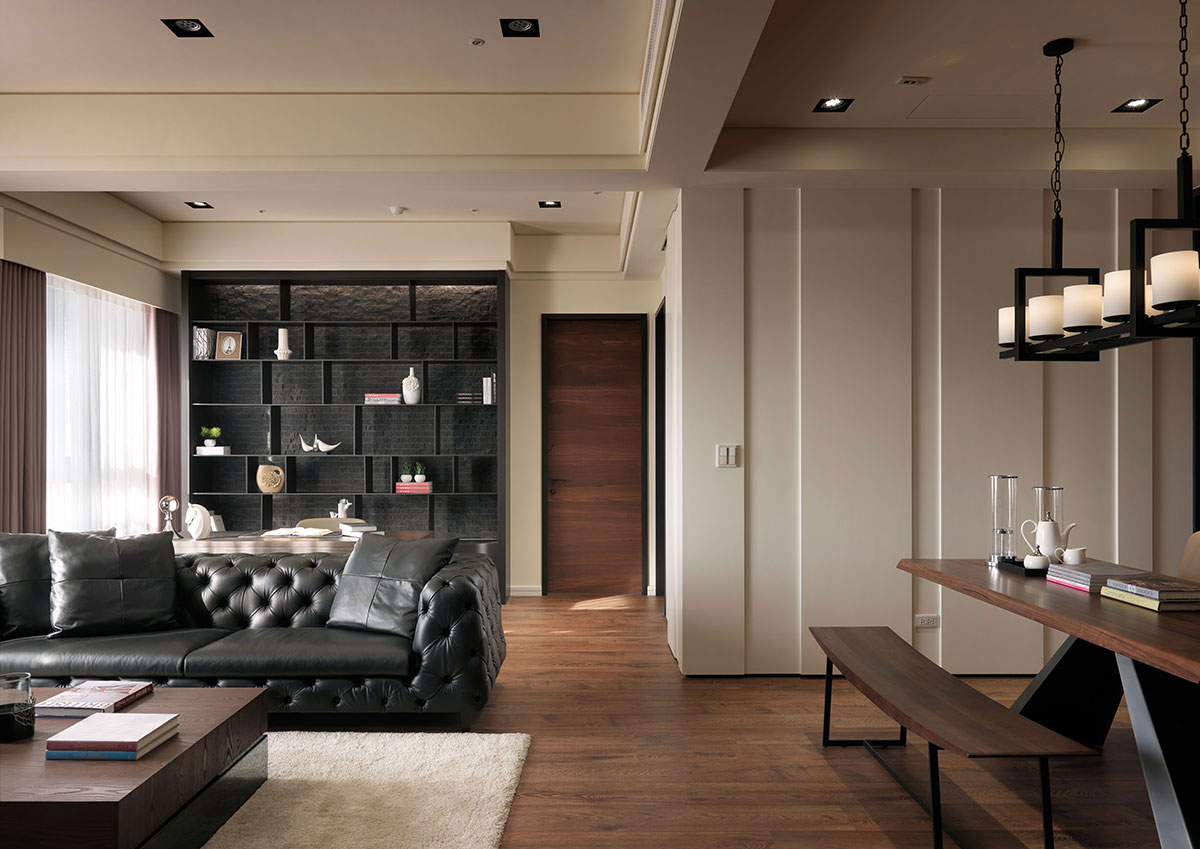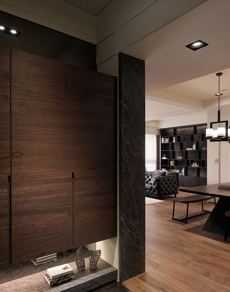 一般在規(guī)劃隔間時,若只是多加一道墻劃分,不免有些可惜。因此,設(shè)計師建議在場域與場域間,若有隔間需求時,可以透過雙面柜的概念,達到機能界定與收納加倍的兩種效果。而在設(shè)計表現(xiàn)上,也能針對整體的風格設(shè)定,運用一些造型語匯,讓柜體無違和地融入空間中。