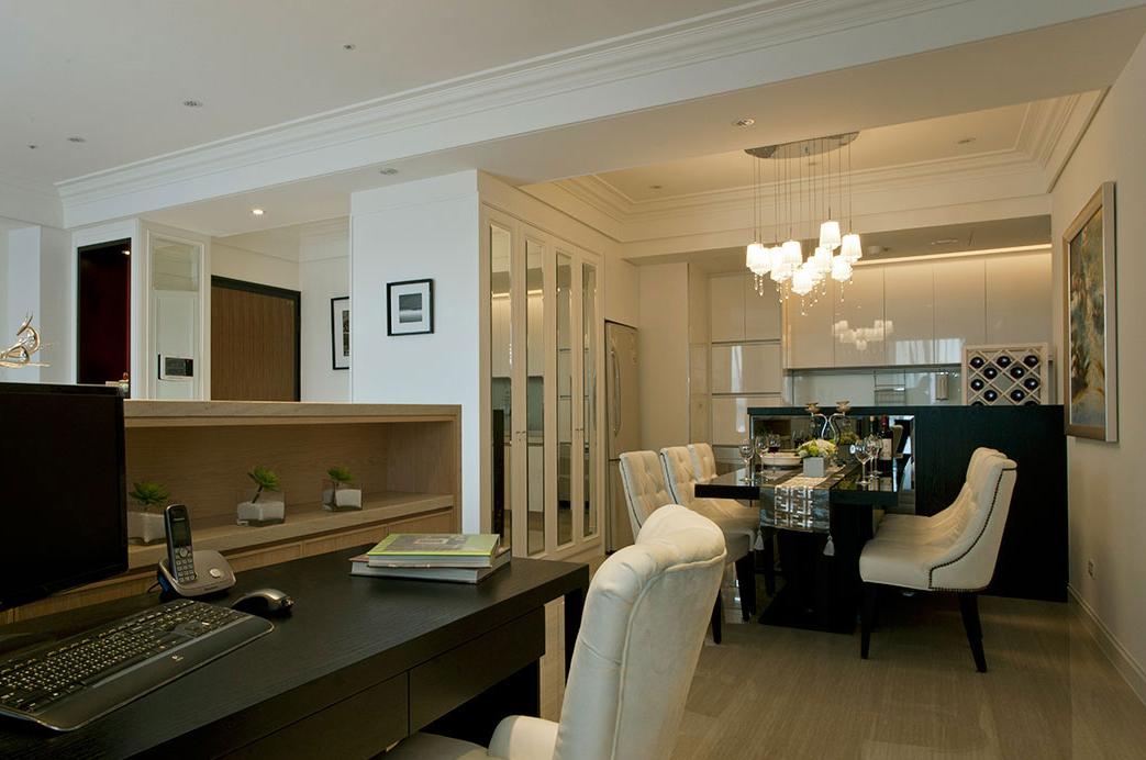 雙面柜施以線板造型,呼應(yīng)整體的新古典表現(xiàn)。