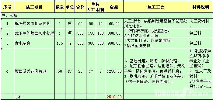 (1)鋪設(shè)地磚―主材是地面磚,輔材為水泥、黃砂、水及膠水,價(jià)格副料為10/M2,其中主材每平方的算法是1/(A*B),然后再乘每塊磚的價(jià)格,(很多裝修公司有進(jìn)一現(xiàn)象,指11.3塊算12塊,這是不合理的)損耗是5%?! ?br />     (2)制作踢腳線,應(yīng)有踢腳線基層(9厘板+3夾板)+踢腳線線條+油漆+人工價(jià)格?! ?br />     (3)墻頂面乳膠漆,應(yīng)該有基礎(chǔ)處理+乳膠漆面底漆+人工的價(jià)格?! ?br />     (4)石膏板吊頂,按投影面積計(jì)費(fèi):輔材+人工價(jià)格?! ?br />     (5)門安裝,應(yīng)該是包含門及門附屬部分的安裝(如合頁(yè)、鉸鏈、門鎖、門吸)+油漆+人工