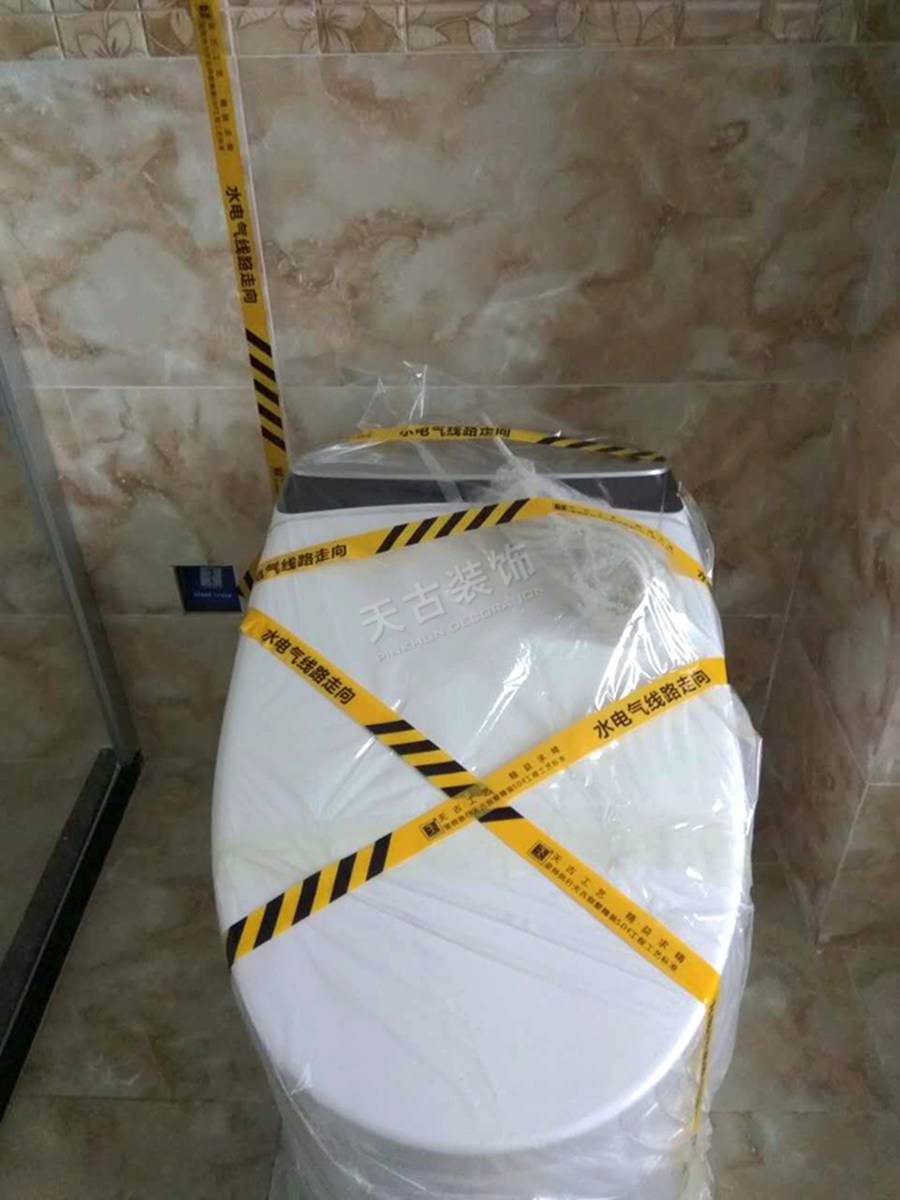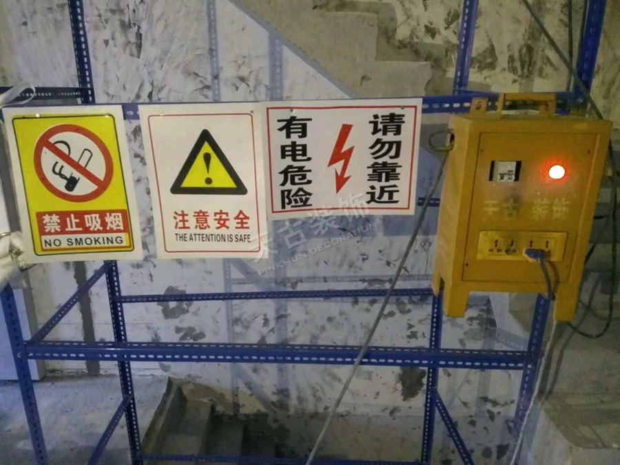 設(shè)有臨時(shí)取水位和臨時(shí)衛(wèi)生間;安全警示標(biāo)志非常完善,以保證施工安全;質(zhì)檢工具齊全,驗(yàn)收工序完整齊全;衛(wèi)生間、廚房等門(mén)檻做了特殊防水處理;臨時(shí)衛(wèi)生間坐便器做了特殊處理;