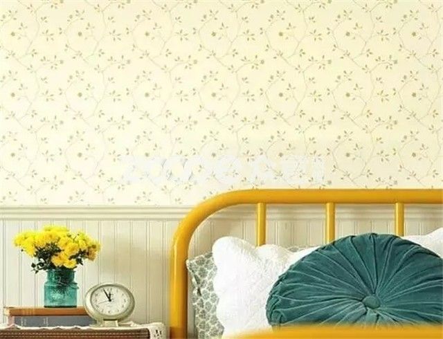 臥室墻面淺黃色壁紙,搭配上綠色小葉子,一股清新之感撲面而來。它和黃色的床頭,黃色插花相映成趣,極具美感。