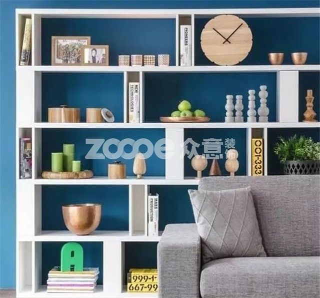 客廳深藍色的墻面,在來個白色的書架,擺上各種小擺件,是不是覺得很不錯,有種明快的優(yōu)雅。