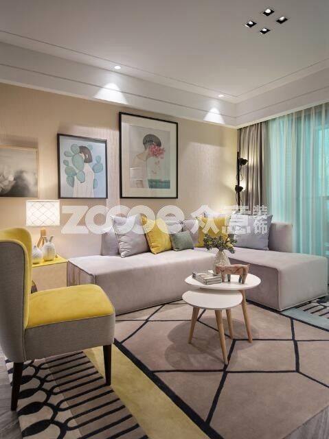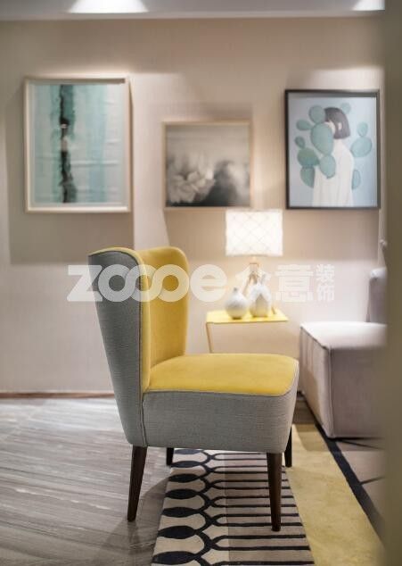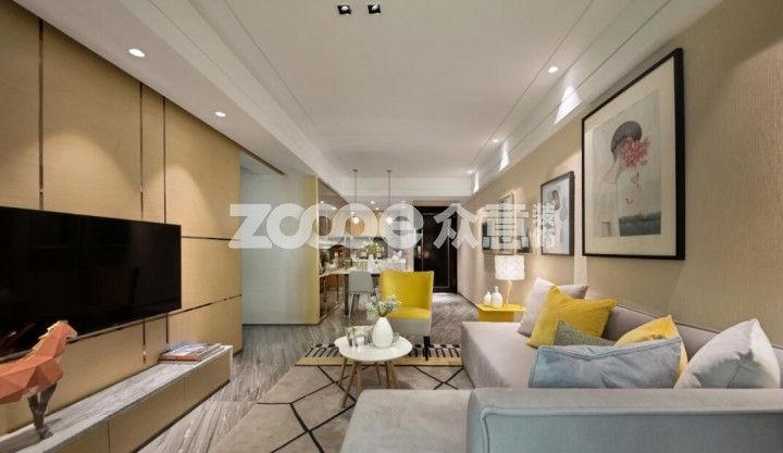 雖然不飽和但依舊亮眼的黃與淺松石藍(lán)的搭配,只看一眼就能讓人瞬間靜下來,而色彩的搭配讓空間更具有層次感;唯一稱得上華麗的恐怕是電視背景墻;客餐廳一體,視線盡頭的黃色單人沙發(fā)給空間巧妙的做了隔斷。