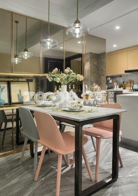 冰淇淋色隨處可見,餐椅顏色也是經(jīng)典的配色,粉配藍(lán),讓人一下子就聯(lián)想到了夏天;桌上花瓶里插著粉色玫瑰,低垂的花苞含羞待放,主人似乎也不急于欣賞它開放的姿態(tài)。