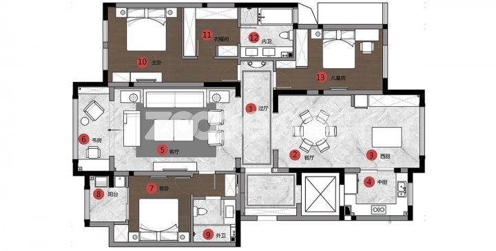 采用了套間的設(shè)計,包含衣帽間與獨立衛(wèi)生間,滿足男女主人生活需求。