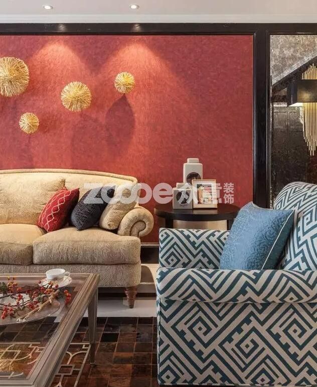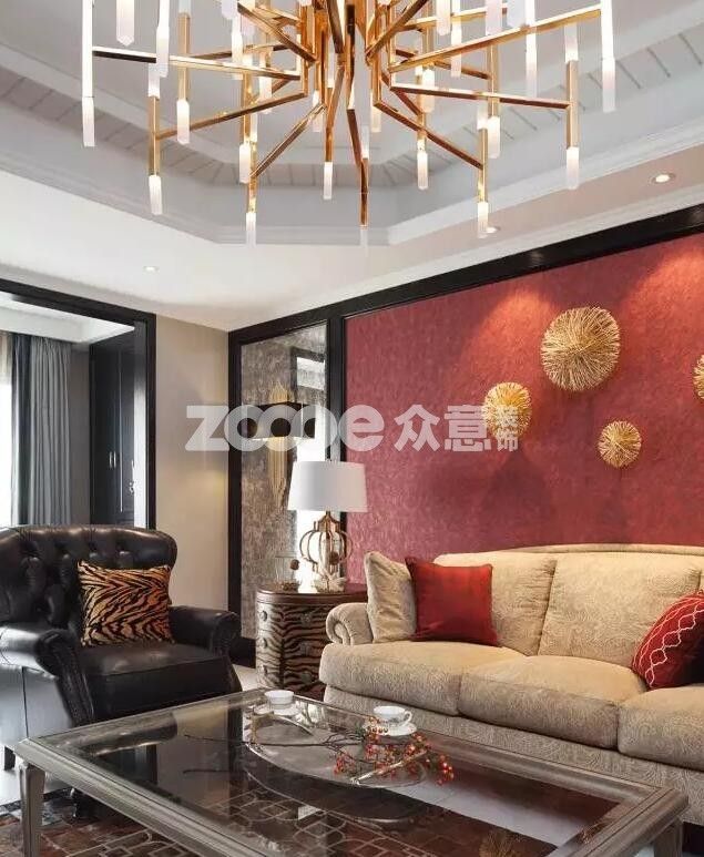 精心挑選的金屬質(zhì)感的吊燈、流蘇壁燈、墻壁裝飾讓客廳又有了一種獨特的味道。