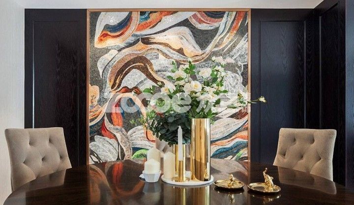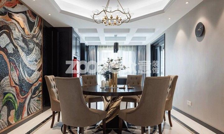 用馬賽克拼出一副美麗的畫作,并以此來作為餐廳的背景墻搭配圓形餐桌。