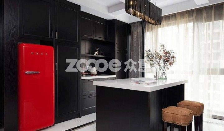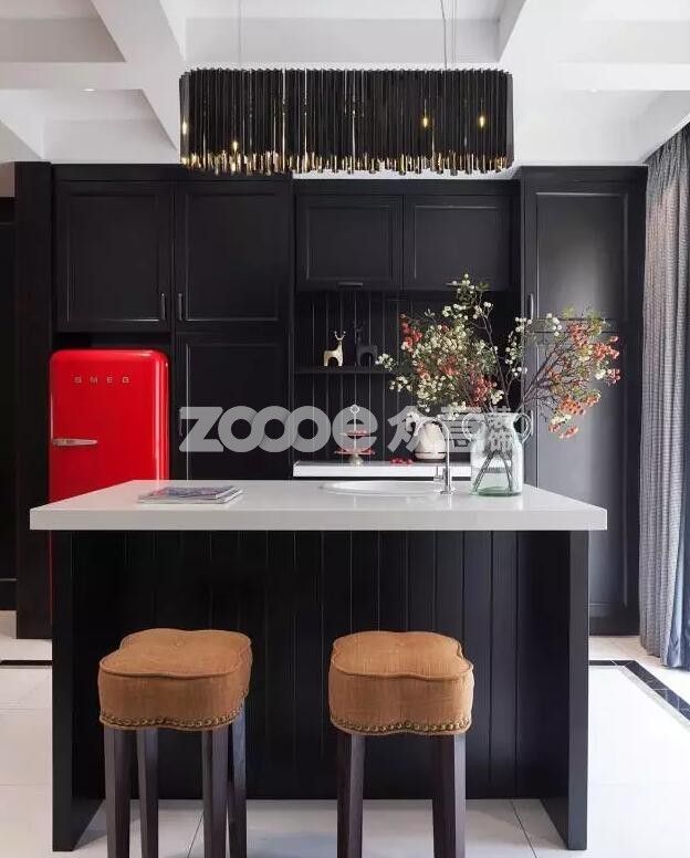 西廚區(qū)域,紅色的冰箱嵌入黑色的櫥柜,時尚又亮眼。井字形的吊燈造型設(shè)計,很有美式風(fēng)格的特點,黑色的吧臺搭配白色臺面,美觀實用。