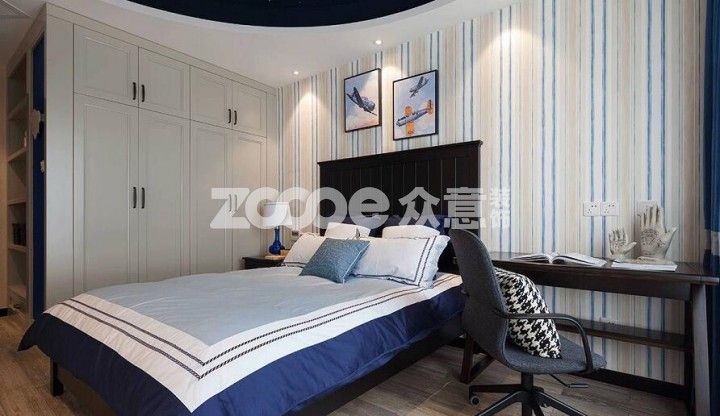 將原空中花園于室內(nèi)打通,作為小主人的臥室,墻面的飛機畫,閃爍的星空頂,設(shè)計師給了孩子的一個星空夢。