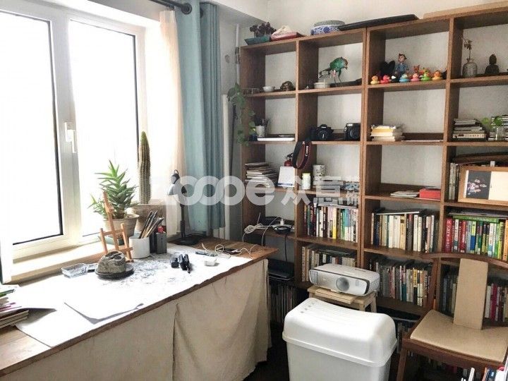 越是狹窄的房間,越是反其道而行,一件小小的書房只放兩樣?xùn)|西:書架+長桌。