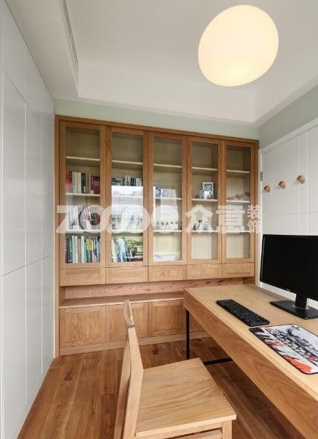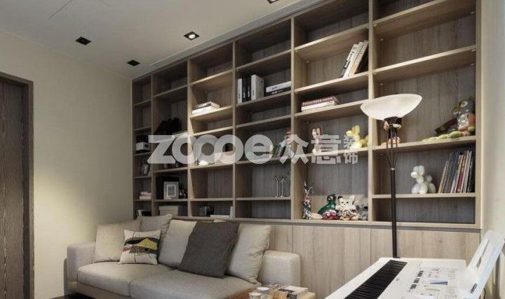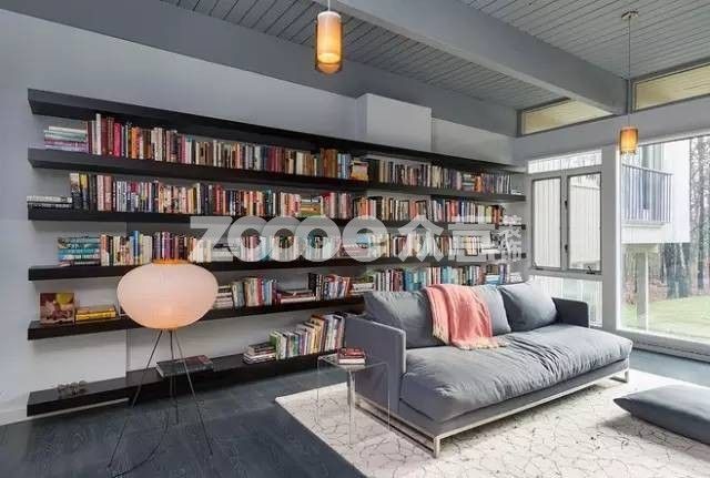 客廳空間夠大,整面墻全部用作書柜也是可以的,節(jié)省了書房空間。