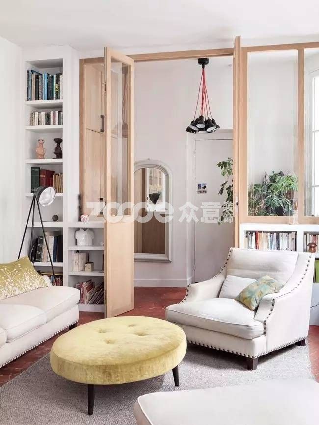 建筑還保留著原先的格局,設計師Camille Hermand 卻利用了更巧妙的方法將它分割,過道與客廳之間的隔墻被拆除了部分,重新利用定制的儲物架得到延伸,屋主的書籍、擺設都可以得到妥當?shù)臄[放,室內(nèi)以純凈的白色調(diào)為基底,家具也采用線條圓滑、溫暖的米白色為主,營造出優(yōu)雅柔和的基調(diào)。