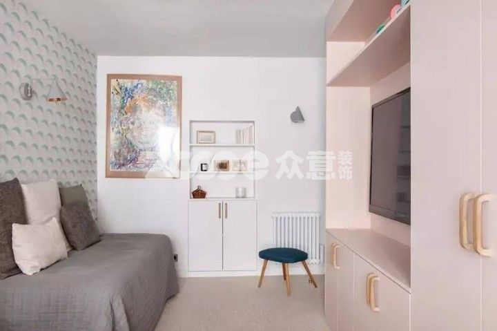 室內(nèi)的布局如同迷宮般有趣,多處“隱藏”的門,讓功能區(qū)的尋找也充滿了樂趣,通過架高的木質(zhì)樓梯,小巧的門框,便聯(lián)通到了臥室區(qū),白色基底下粉色的定制衣柜與地毯互相呼應,灰色調(diào)的單人床、壁紙、裝飾畫,色彩豐富卻十分的柔和,更增加了甜蜜與夢幻感。