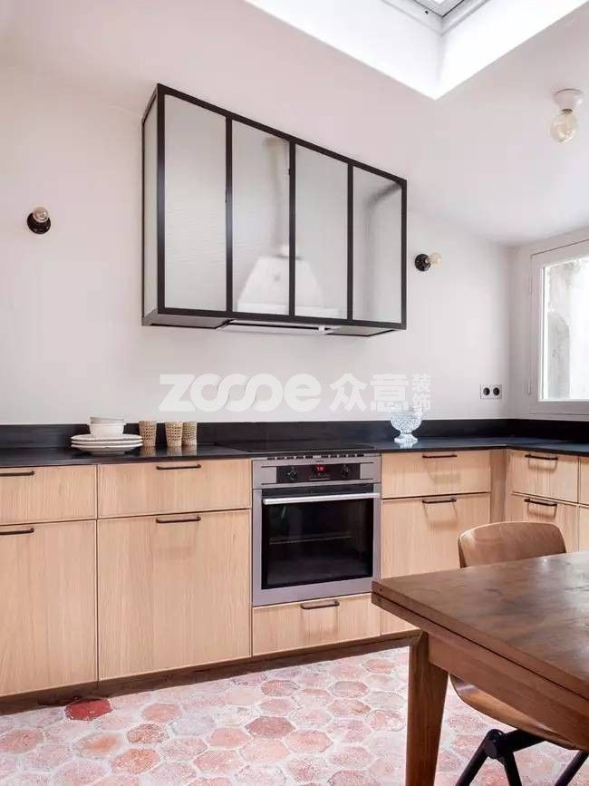 在廚房的天花上,設計師特意開設了天窗,讓光線可以從四處灑進室內(nèi),避免豐富的櫥柜以及黑色調(diào)大理石帶來的壓抑感。