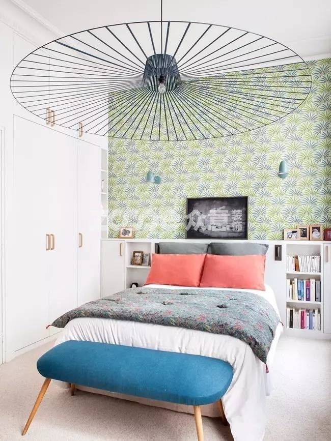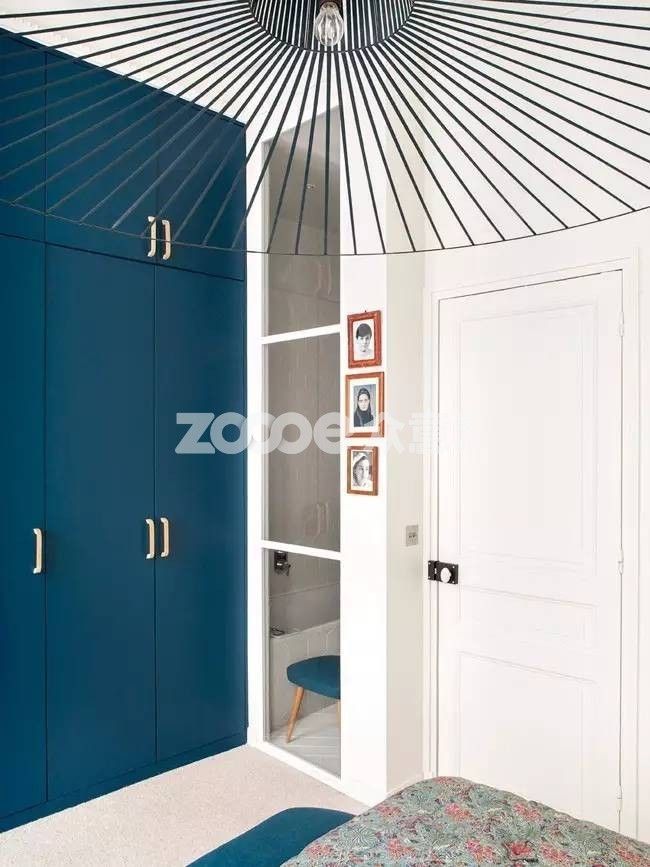 另一間臥室利用定制的柜體讓室內(nèi)擁有豐富的儲物空間,所有東西都收納妥當,帶來潔凈清爽的視覺效果,夸張的吊燈、紅色的點綴,藍色調(diào)的延伸從臥室至洗浴室,素雅的空間也擁有多處視覺焦點。