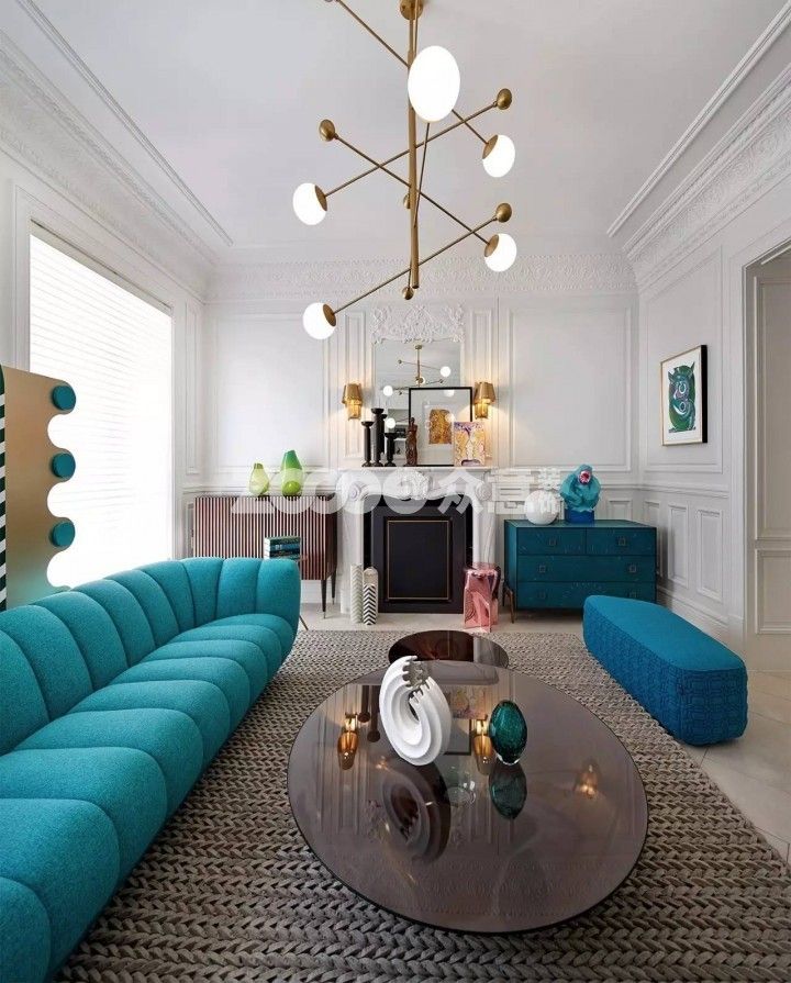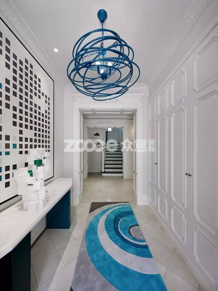 最吸引眾意小編的是玄關(guān)的這頂燈,藍(lán)色金屬串聯(lián)起來(lái)的線條,看似雜亂其實(shí)有跡可循,與地上呈放射狀圓弧形的藍(lán)色地毯,形成呼應(yīng)。