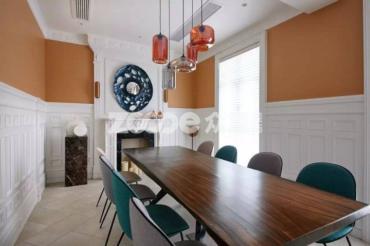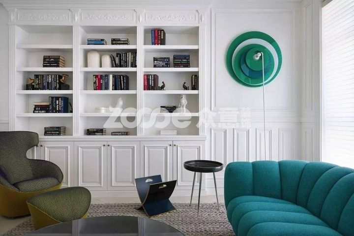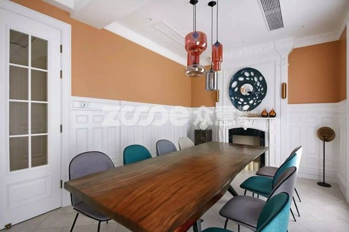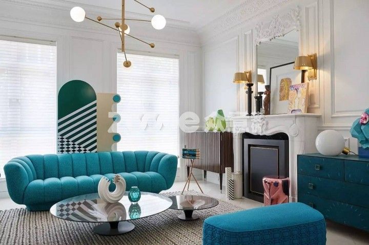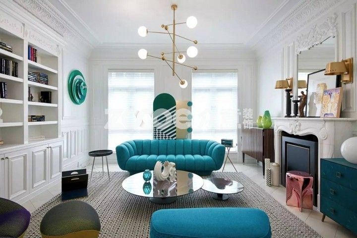從來(lái)沒有哪個(gè)設(shè)計(jì)師會(huì)在一個(gè)空間里放這么多色彩,似乎曾經(jīng)保持不超過三色在這里被打破了。這樣的軟裝布局,華麗的石膏線——古典的裝修手法,搭配現(xiàn)代的家具——沙發(fā)背后的異形屏風(fēng),摩登又有趣。