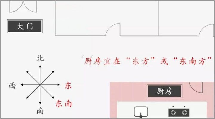 廚房宜在東方,所謂“紫氣東來”,“紫氣”便是財(cái)氣,廚房放在這個(gè)方位是利財(cái)?shù)?。東方為八卦中的震卦,五行屬木,而廚房五行屬火,呈木火相生之象,特別適合在此方位設(shè)置廚房或者餐廳,有利于家人的財(cái)運(yùn)和健康。且東方是日出的方向,適當(dāng)?shù)奶柲芰窟€能保證廚房的干燥,減少陰濕,有利于居住者的健康。東南方為八卦中的巽卦,五行亦屬木,同理,也特別適合把廚房安置在這個(gè)方位。