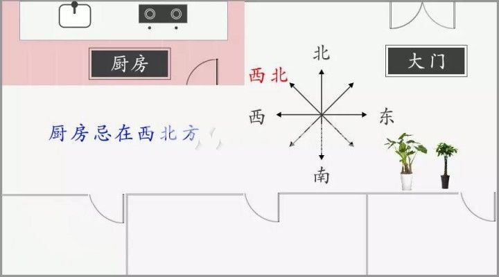 西北方為八卦中的乾卦,五行屬金,而廚房五行屬火,若設(shè)置在西北方,就會(huì)呈金火相戰(zhàn)之象,“火克金,易操心”。此布局還形成了風(fēng)水中常講的“火燒天門”格局,其中“火”為廚房,代表家中的女主人;“天門”指西北方,代表家中的男主人。如此布局不僅會(huì)導(dǎo)致財(cái)運(yùn)破敗,還會(huì)造成婚姻危機(jī),同時(shí)也不利于男主人的身體健康,容易患肺部、心臟方面的疾病。因此,最好讓廚房避開家宅的西北方。如果廚房已經(jīng)在家宅的西北方,可用五行通關(guān)法來化解。