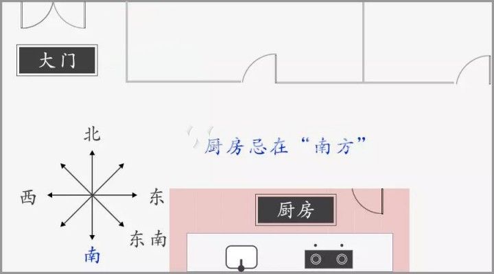 南方為八卦中的離卦,五行屬火,而廚房本身火氣就重,如果設(shè)置在南方,火上加火,對(duì)居住者的身體健康極為不利,易上火、煩躁、情緒不穩(wěn)。再者,南方太陽之氣濃郁,食物易腐化,是破財(cái)敗運(yùn)的象征。如果廚房已經(jīng)在家宅的南方,建議用五行屬土的擺件。