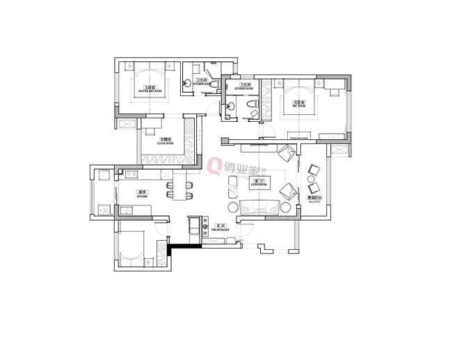 2、改變主臥入口,能更好利用邊角空間, 增加儲(chǔ)物功能。
