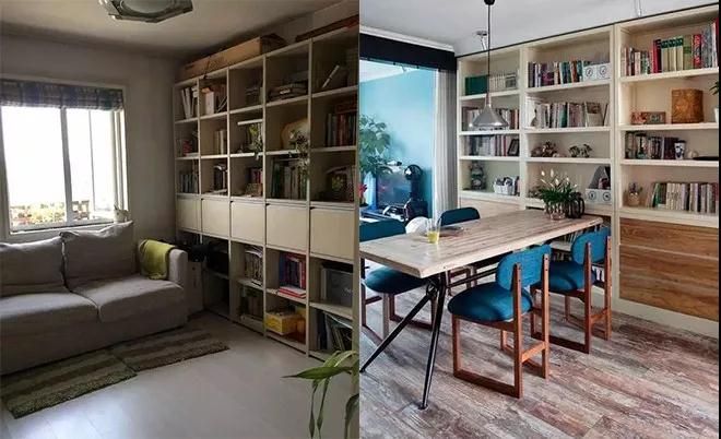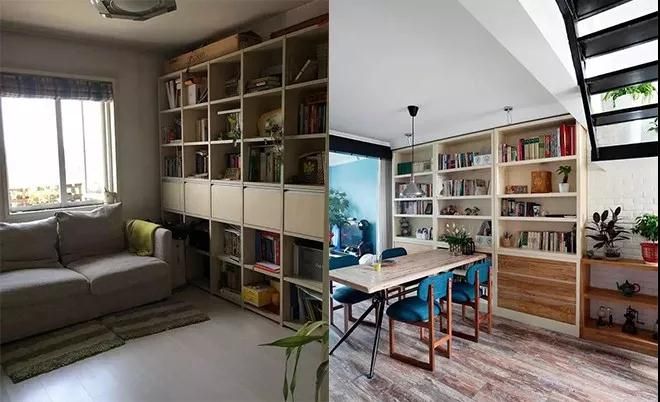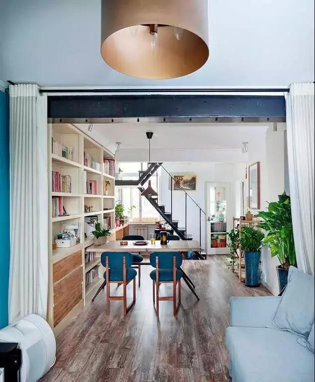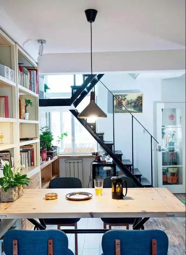 把餐桌從樓梯下移出,增加墻面收納柜,擺放上書籍和植物,增加生氣。