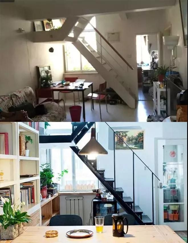改造后:保留原來樓梯的鋼架結(jié)構(gòu),去除厚重外殼,涂刷黑漆,利落的線條讓整個空間更立體。