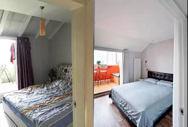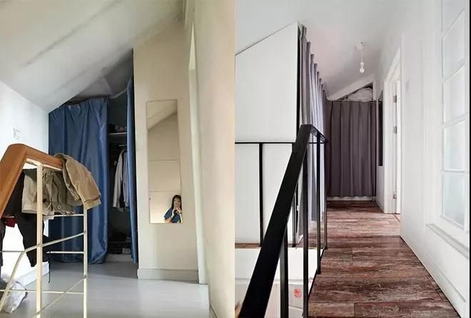 改造前:原先的衣柜,設(shè)置在臥室的門口位置,一個斜坡的夾角,空間容量小,以至于業(yè)主的很多衣服都直接搭在樓梯扶手上,另外穿衣鏡的位置設(shè)計不安全,后退幾部就是樓梯,容易踏空。