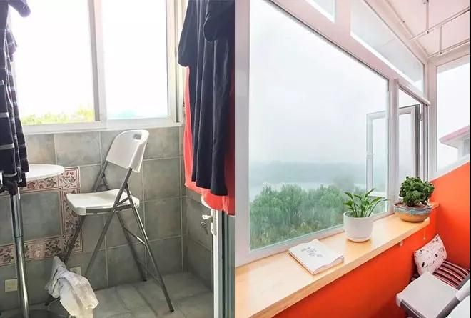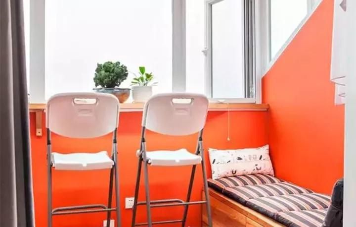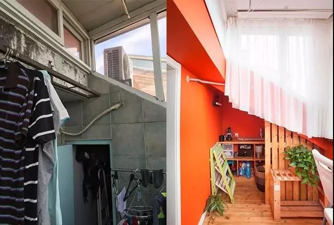 陽臺重新翻新了一邊,這時改頭換面的變化,以前破敗的墻面現(xiàn)在換成了活力十足的橙色瓷磚飾面,地板采用了防腐木,右側(cè)設(shè)計單獨的儲物區(qū),方便收納洗衣設(shè)備,并配備了榻榻米,閑來無事的時候躺在上面曬曬太陽,簡直再舒服不過了!