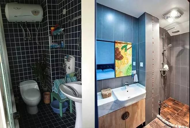 以前暗沉沉的黑白馬賽克瓷磚也換位了大塊灰色和藍(lán)色的組合,配以木質(zhì)洗手臺,整個空間亮起來了。