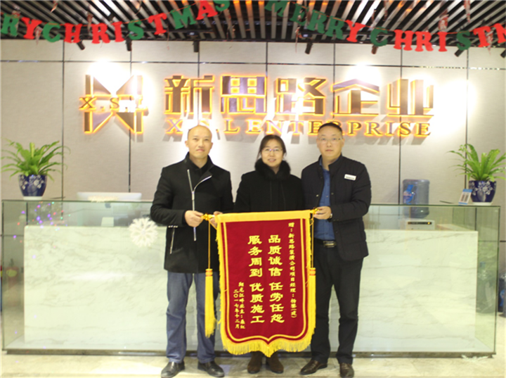 12月21日,來自翔龍江畔的業(yè)主桑老師將一面印有“品質(zhì)誠(chéng)信,任勞任怨,服務(wù)周到,優(yōu)質(zhì)施工”的大紅錦旗交到工程部文經(jīng)理手中,以感謝新思路裝飾精湛的施工工藝和高品質(zhì)的裝修服務(wù)。