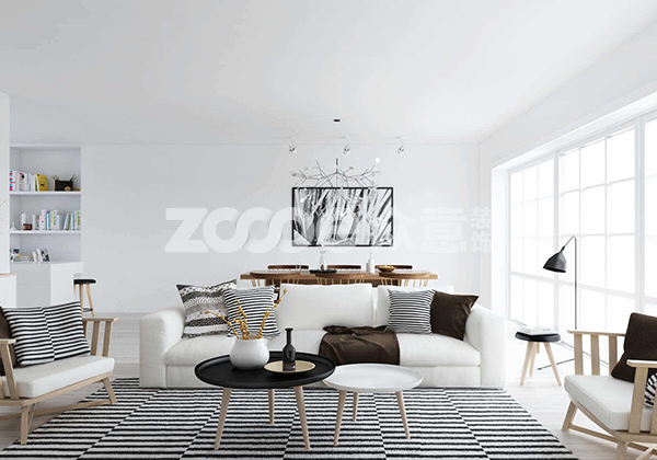 我們可以看到,客廳內(nèi)主要的家具有沙發(fā)、小桌子、小板凳等,這些家具的主色調(diào)是黑白兩色,其中白色為主體,黑色作為點綴,花紋及圖案主要是橫條紋的圖案,沒有過多累贅的裝飾。在沙發(fā)一側(cè)擺放著一個立著的燈飾,這個落地?zé)舨粌H能夠起到照明的作用,同時從裝飾的角度來看,它與整個客廳的色調(diào)是和諧的,造型簡單不喧賓奪主,吊頂?shù)臒麸梽t是銀色的,以多觸角的造型呈現(xiàn),細支架的吊頂燈飾使得吊頂不會過于累贅,同時銀白色也能起到很好的點綴作用。