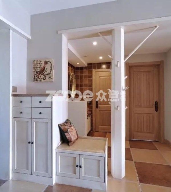 隔斷墻材質(zhì)可以多樣性,如果喜歡通透性的可以用鏤空的木架玄關(guān);如果喜歡遮擋強的,可以直接定制玄關(guān)柜或者砌隔斷墻。