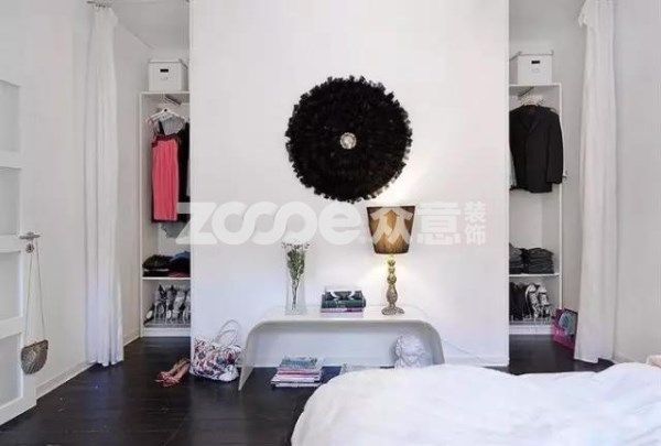 在空間有限的情況下,可以利用隔斷墻創(chuàng)造衣帽間。把床前移幾十公分,裝上隔斷墻,輕松打造衣帽間。