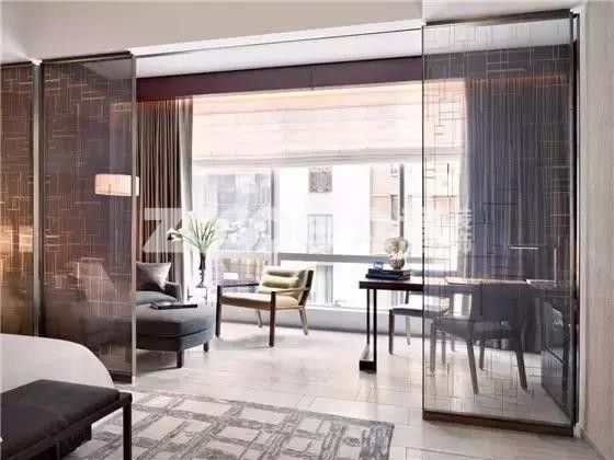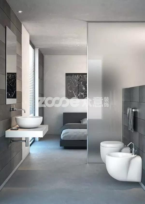 有些業(yè)主不喜歡直接將主臥設(shè)計成單獨的小房間,就會用隔斷墻的形式來隔開床和衛(wèi)生間。玻璃隔斷是最常用的主衛(wèi)隔斷。