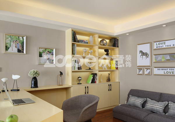 見光不見燈最適合的空間莫過于小戶型的家居了,小戶型住宅因為面積較小,因此房屋的設計以簡潔、多功能為主,而“見光不見燈”的設計,則很好的將燈飾“隱藏”起來,合適的光源發(fā)出溫馨的燈光效果,也能夠帶給小戶型溫馨明亮感。圖上以溫馨小戶型裝修效果圖為例,實木落地式書架自帶燈光的設計,在書架隔板之間安裝了隱形的燈具燈飾布置,這樣既點亮了書架,也讓主人更好的找到需要看的書籍或資料。另外在書房的天花板上,用暗裝方式的筒燈射燈照明,讓天花板看上去簡潔、大方不少,加上屋內搭配的棉麻質感沙發(fā)椅家具組合,呈現(xiàn)出小家小溫馨的氣氛。