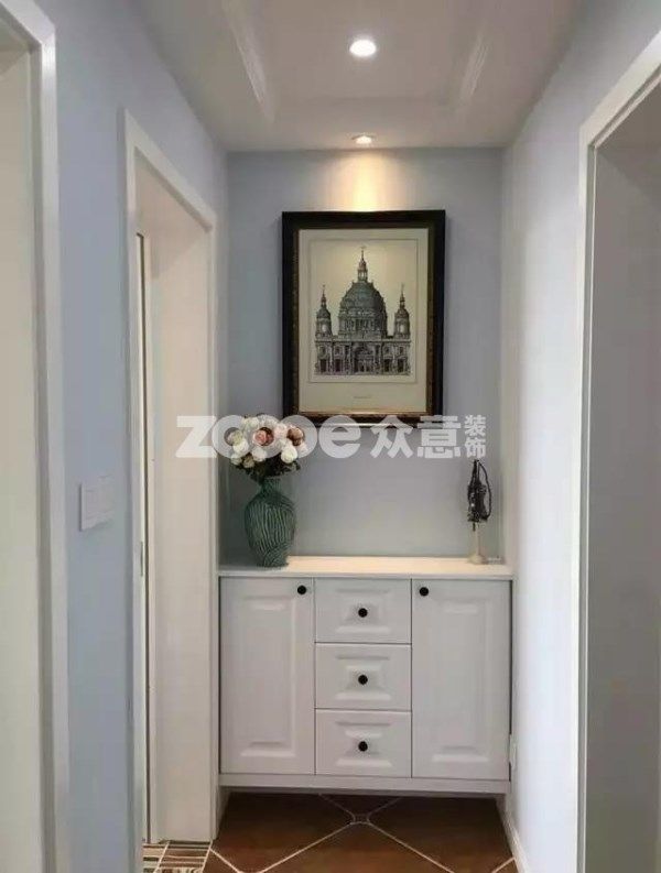 走廊盡頭的裝飾講究簡約,太復(fù)雜和擺放太多的雜物影響走廊的走動空間。最簡答的搭配就是壁柜+裝飾畫。