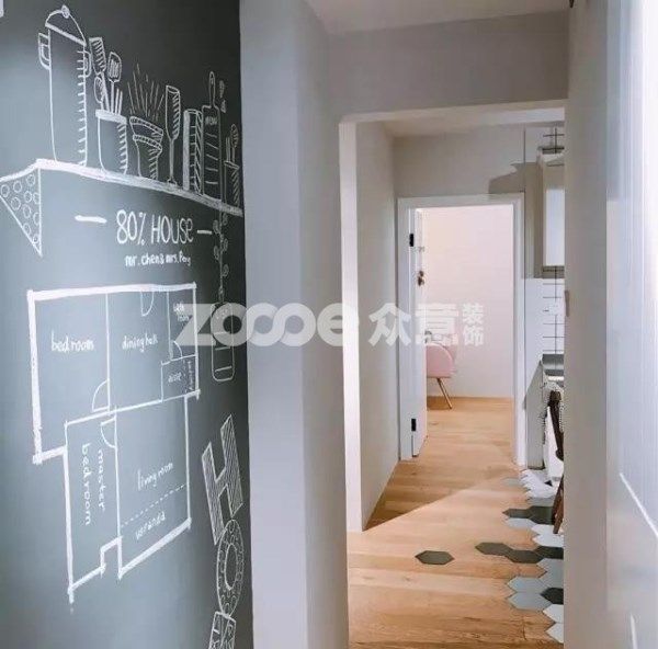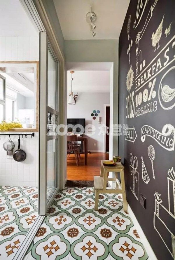 如果不喜歡掛畫這種常規(guī)的裝飾,不妨把走廊整面墻刷成黑板墻。選擇自己喜歡的圖案,做成黑板墻裝飾,又或者直接刷成可以讓小孩畫畫的黑板墻,可以隨時變換裝飾效果。