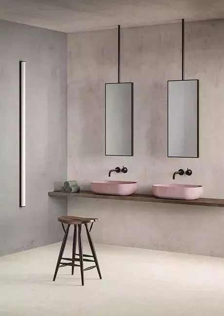 將煙粉與灰色按1:1的比例分配到浴室的墻上、水泥材質(zhì)讓顏色發(fā)揮出極強(qiáng)的質(zhì)感。少許黑色與原木色作為調(diào)劑,讓空間具有一種雅痞氣質(zhì)。