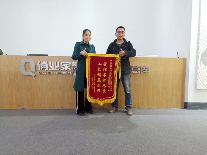 業(yè)主鄧?yán)蠋熧?zèng)俏業(yè)家裝飾工程有限公司部門經(jīng)理何洪華、項(xiàng)目經(jīng)理劉康嘉獎(jiǎng)錦旗——“管理盡職盡責(zé),工藝精益求精”。