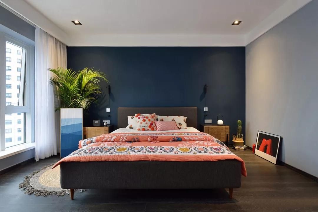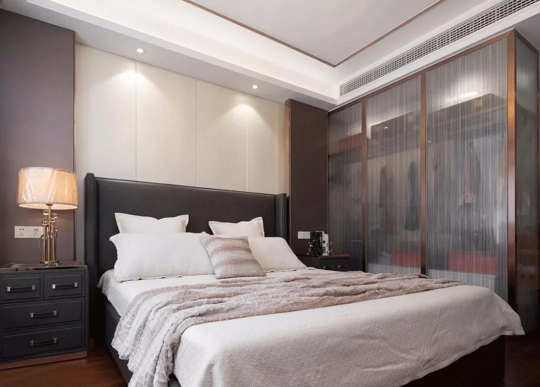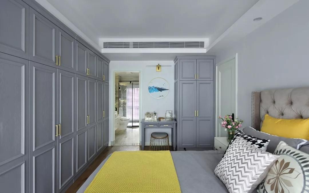 如果進門處有衛(wèi)生間或是衣帽間,面積寬裕的臥室可以將中央空調(diào)的吊頂和衣柜一起設(shè)計,更加合理的利用起空間。