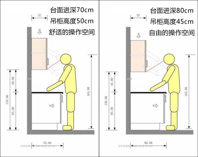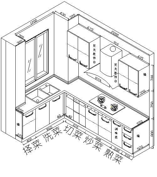 根據(jù)洗菜(水槽)→切菜(臺面)→炒菜(爐灶)按順序進(jìn)行排列,可以順時針,也可以逆時針。 如果位置充裕,可以升級成: 擇菜(臺面)→洗菜(水槽)→切菜(臺面)→炒菜(爐灶)→熟菜(臺面) 擇菜和熟菜的臺面最好在400mm以上。 尺寸規(guī)劃 分區(qū)所需尺寸參考 水槽區(qū):800mm; 切菜區(qū):600mm; 爐灶區(qū):900mm; 柜立柱:25mm/根; 其他區(qū):400mm; 臺面深度:520mm~650mm; 吊柜深度:320~350mm。 廚房有效長度至少2400mm能正常使用   如果家里煮飯的人不固定,可以統(tǒng)一臺面高度800mm,可能會產(chǎn)生下面的不足。 改善方案 臺面高度:炒菜臺面一般750mm舒適,洗切菜臺面一般875mm感覺舒適。 注:高低臺面的設(shè)計。也有不足,當(dāng)你想用水清洗燃?xì)庠钆_面周邊,不能痛快地把水推向水槽。 電器規(guī)劃 廚房三件套電器中,爐灶和油煙機(jī)房肯定是一起的,消毒柜建議放在切菜區(qū)。 注:燃?xì)庠钕路接羞M(jìn)氣口開關(guān),不能被消毒柜遮擋,現(xiàn)在很多廚房設(shè)計圖為了美觀都把消毒柜設(shè)計在爐灶下方,把氣閥放在另一側(cè),如果條件允許,實際規(guī)劃應(yīng)該盡量避免。 配件規(guī)劃 拉籃和碗籃都是提高廚房利用率的利器。 安裝調(diào)味籃預(yù)留位置,可以參考下面尺寸。 如需碗籃,可以參考下面尺寸 水電規(guī)劃 洗菜區(qū)水路規(guī)劃 水路規(guī)劃分為給水和排水。 給水里面走的是干凈的自來水,排水里面走的是生活污水。 給水(PPR管):一般進(jìn)戶水閥開發(fā)商都會預(yù)留在廚房,用三通分出水槽和其他地方用水管道,左熱右冷間距200mm,有吊頂?shù)脑捤芸梢宰咛臁?排水(UPVC管):在公共排水管道利用彎頭和水管接出到水槽下方。