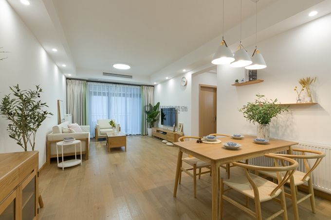 色彩基調(diào)是白色和原木色,白墻落地+木質(zhì)家具,局部用綠植添加一絲活力,這些自然素材的“和諧”讓整個大空間顯得自然且淡雅。