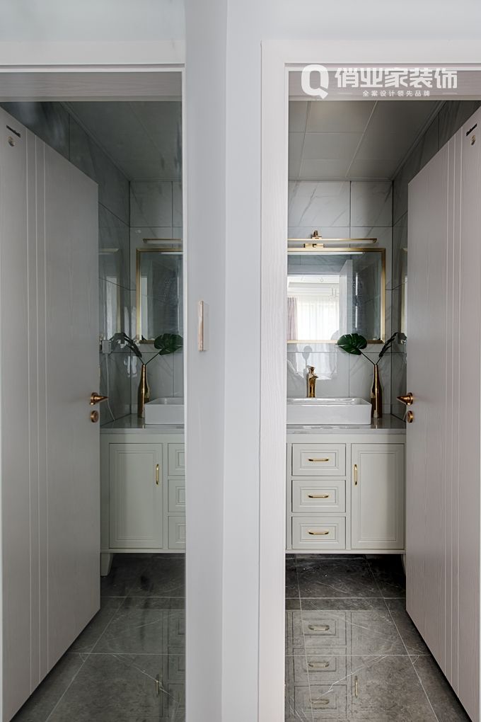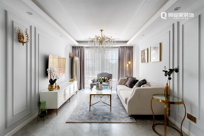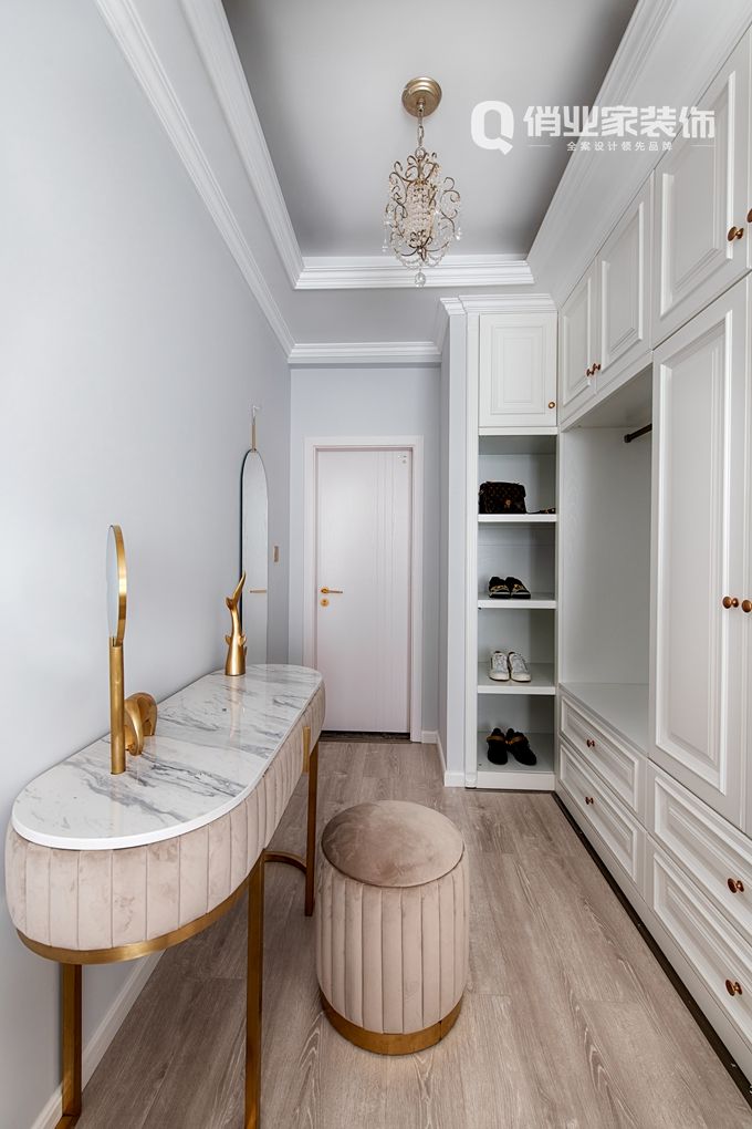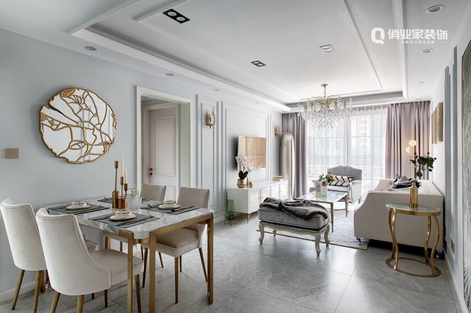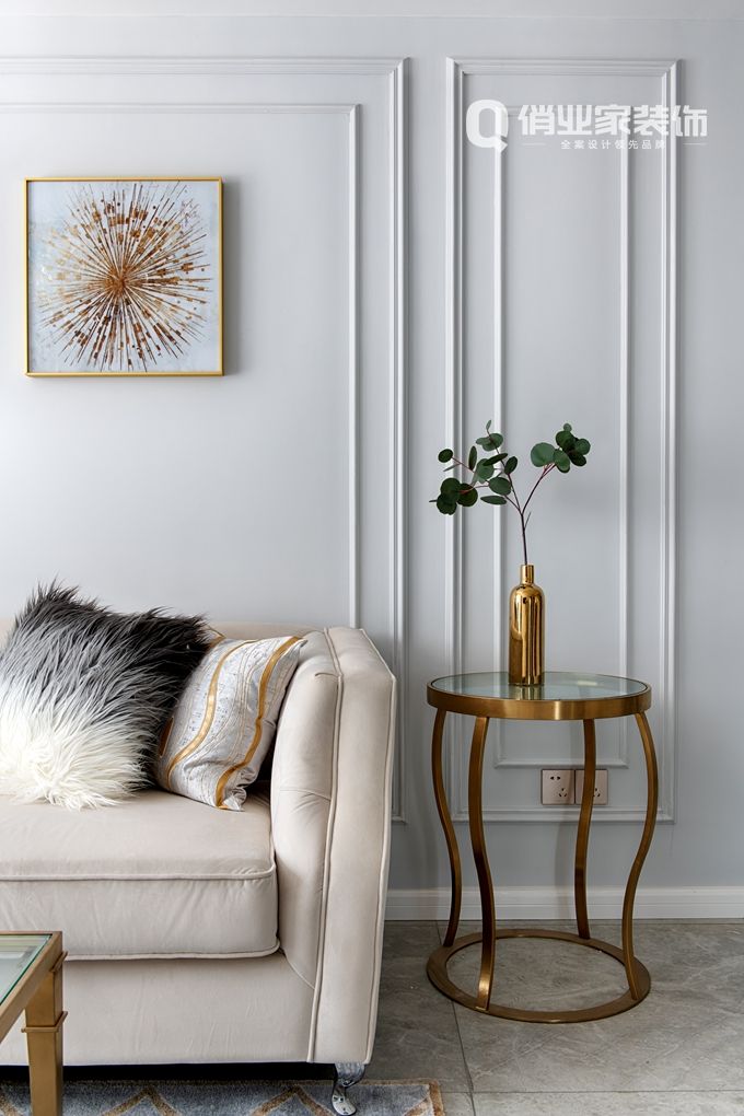 設(shè)計(jì)師吳萱考慮到現(xiàn)代居家簡約的生活方式,也為了保留那份輕松的姿態(tài)。所以,整屋墻面勾勒了整齊的石膏線條增加法式裝潢效果的層次感,白色和金色搭配則非常優(yōu)雅 ,結(jié)合藍(lán)灰淺色的墻面讓空間變得更加溫柔。
