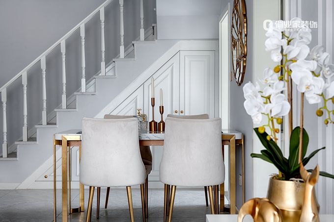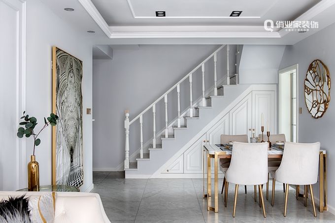 餐廳比鄰客廳,光線充足,不論身處餐廳還是客廳,都可以感受到愜意的生活氛圍。同時(shí),為了保證空間的舒適度,并沒有設(shè)置酒柜或置物架,而是依靠樓梯下方有超大儲物功能,解決了戶型短板,也滿足了家庭實(shí)用性。