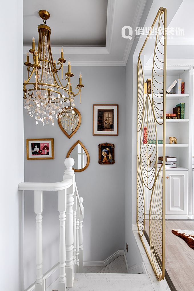 在樓梯這里,設(shè)計(jì)師花了更多的心思在軟裝上。樓梯墻面手繪掛畫,完全的手畫設(shè)計(jì),經(jīng)過多次組合陳設(shè),最終確定陳設(shè)方案,才有了現(xiàn)在的效果。